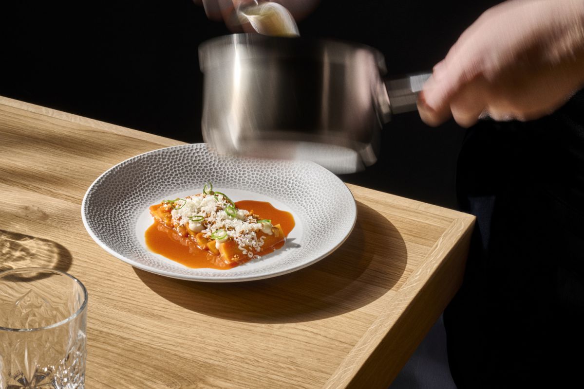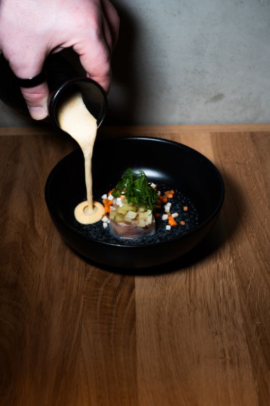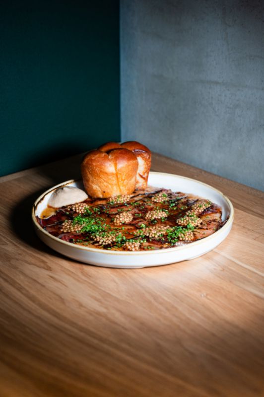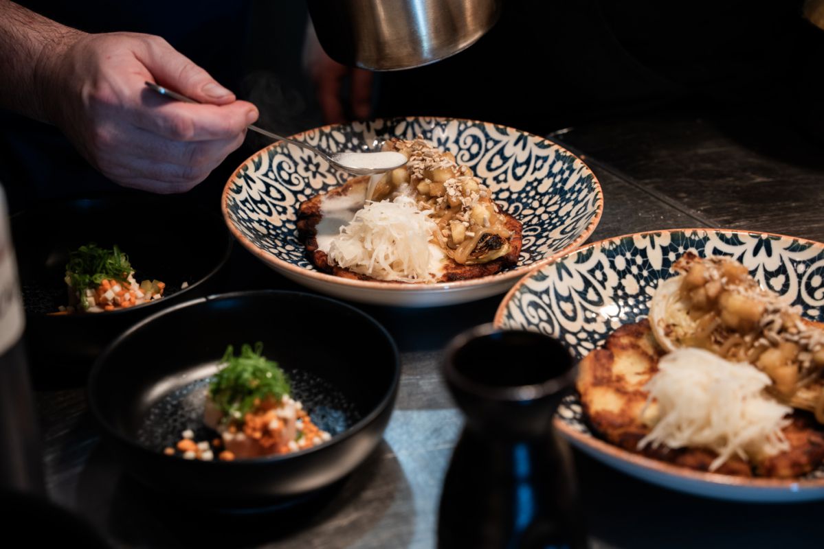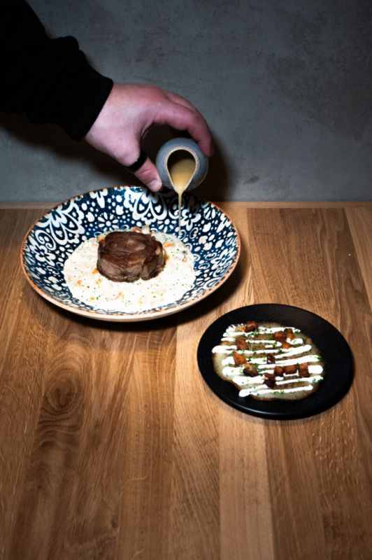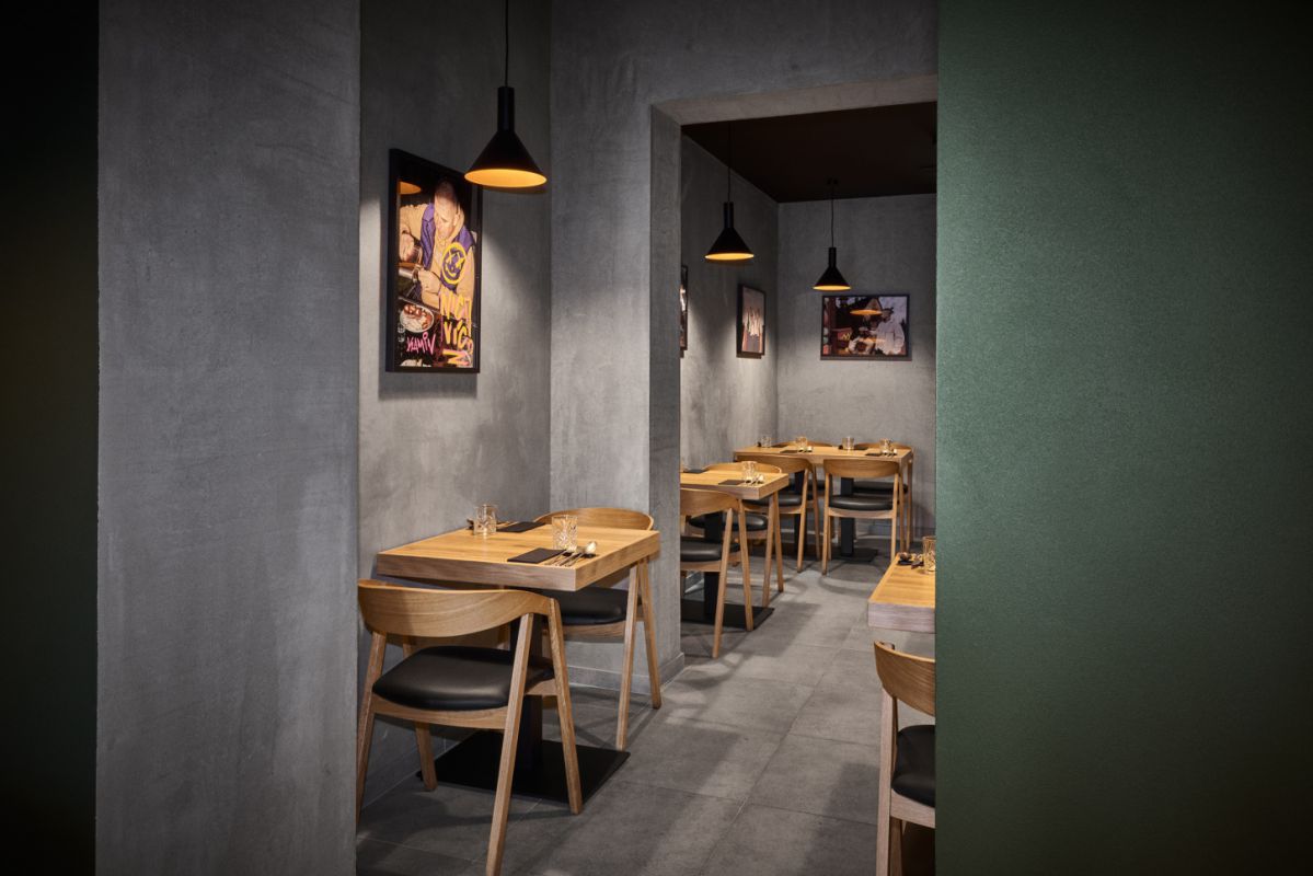 Interiér restaurace pracuje s kontrastem dřeva, betonu a industriálních prvků. Prostor má působit živě a přirozeně – stejně jako kuchyně samotná.