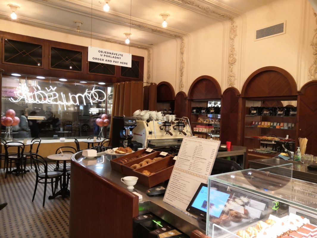 Kavárna vyniká výbornými zákusky. Bod ubíráme za nutnost objednávání u baru.