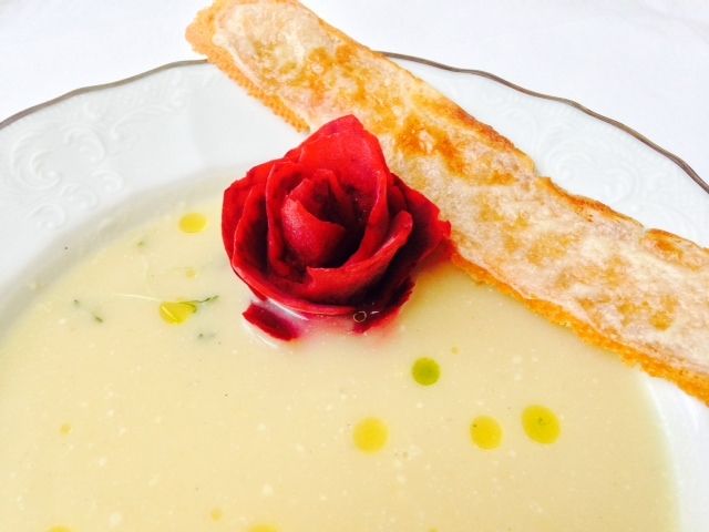 Cream of topinambur with goat cheese Crostini and pickled beets