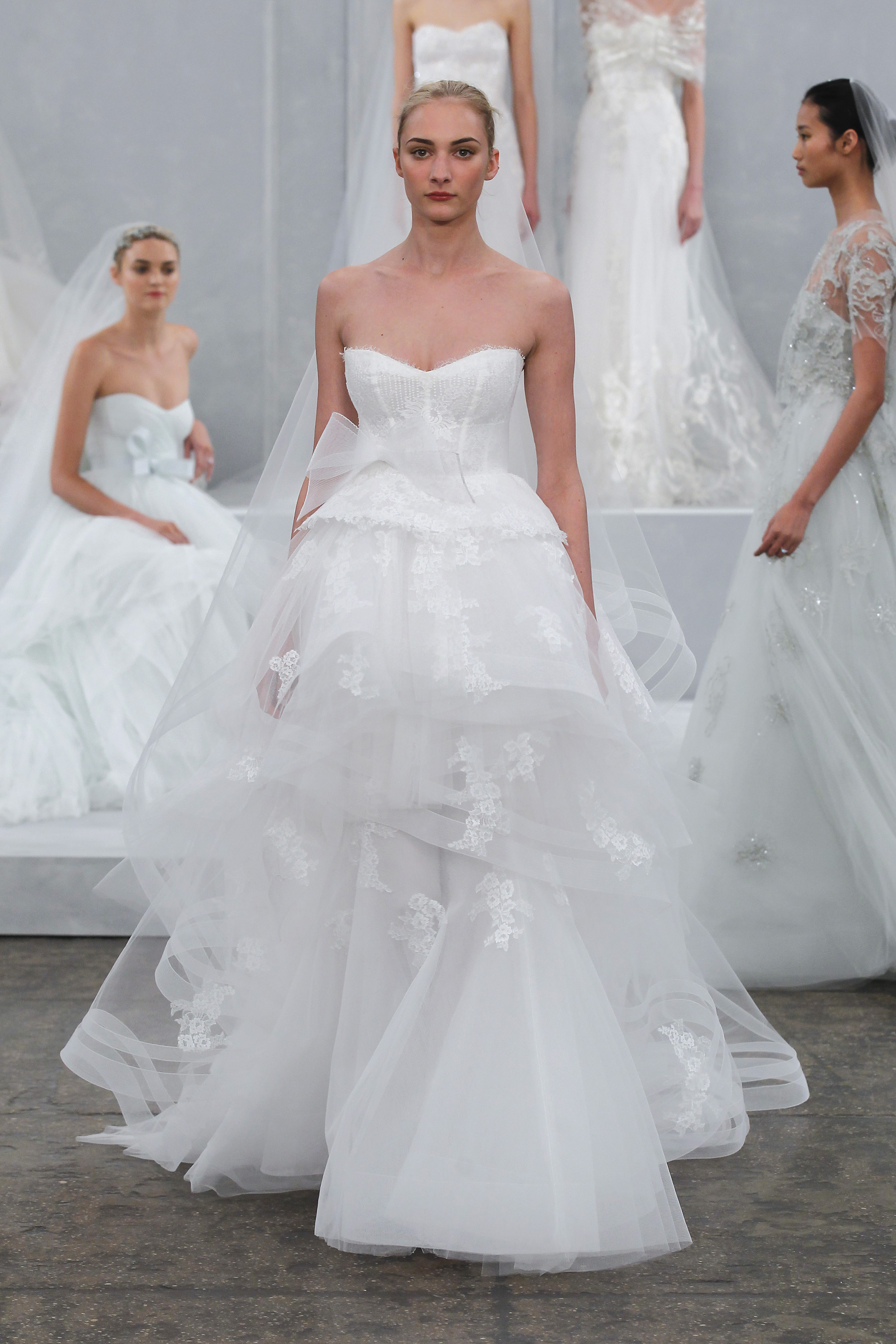 Transparentní materiály, v podobě nadýchaných tylových sukní, předvedla ve své kolekci Monique Lhuillier.