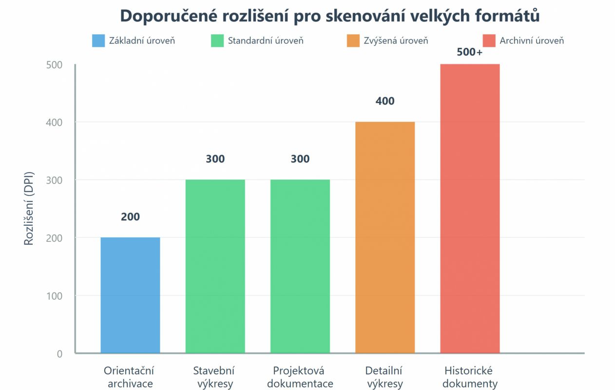 Pro stavební výkresy a projektovou dokumentaci se osvědčilo rozlišení 300 DPI jako nepsaný standard. Zachovává dostatečnou čitelnost kót, popisků a jemných čar, přičemž velikost souborů zůstává přiměřená pro běžnou práci. Pokud skenujete historické dokumenty s drobnými detaily nebo plánujete pozdější zvětšování konkrétních částí, volte raději 400 až 600 DPI.