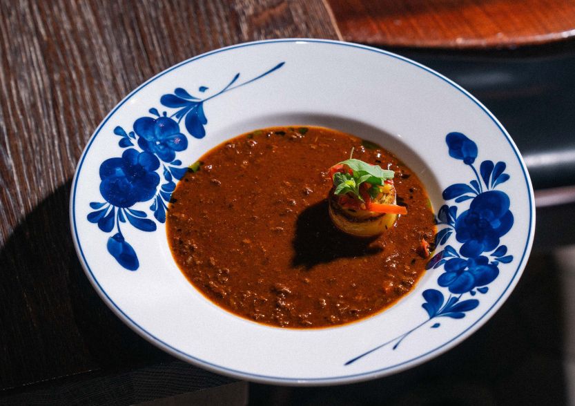 Další chod ukazuje, jak se dá pracovat s klasikou, tak trochu jinak. Gulášová polévka je postavená na nahrubo mletém hovězím krku, silném cibulovo-paprikovém základu a majoránce. Recept a suroviny zůstávají poctivé, prezentace se mění. Do hlubokého talíře přijde bramborový fondán, připravovaný metodou sous-vide s bylinkami, následně opečený na másle. Přidají se grilované papriky naložené v oleji, pár kapek bylinkového oleje a čerstvá majoránka. Polévka se zalévá až před hostem.