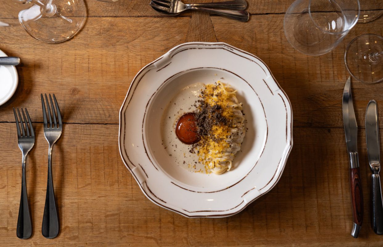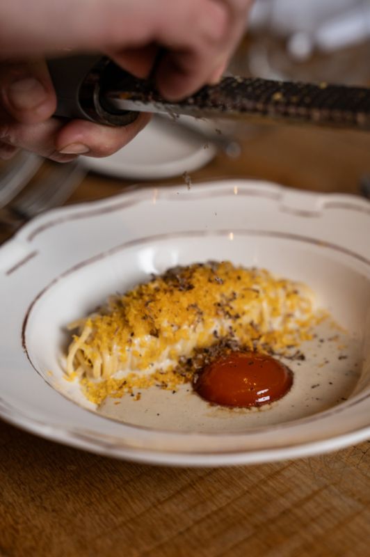 - linguini s Perigordským lanýžem, žloutkem, parmazánem a Champagne omáčkou,