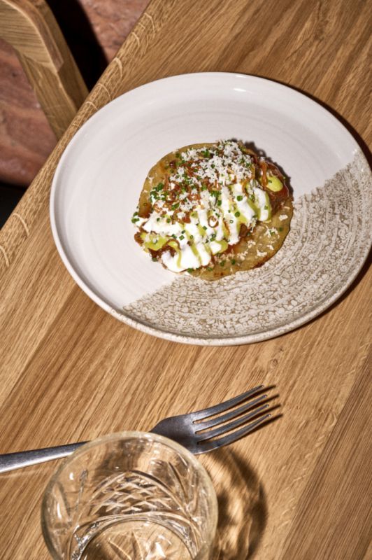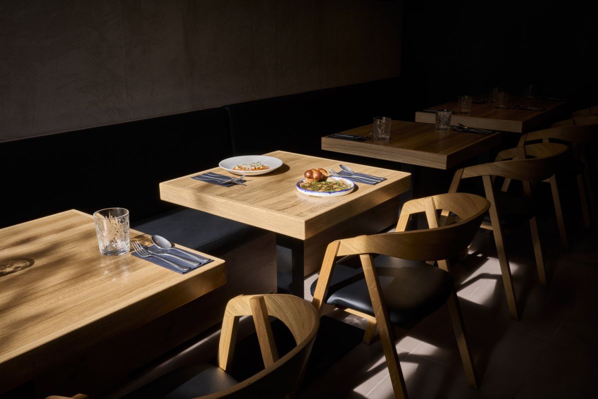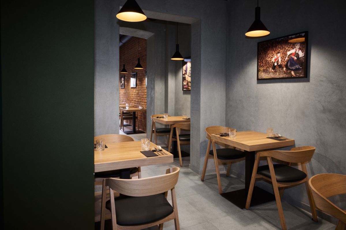 Interiér restaurace pracuje s kontrastem dřeva, betonu a industriálních prvků. Prostor má působit živě a přirozeně – stejně jako kuchyně samotná.